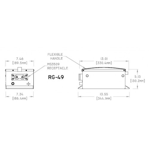 RG-49 is a fire resistant battery with a powder coated aluminum container with riveted cover. Two metal foot brackets are welded to the battery container on each side. Vent tubes are integrated into the container. MS3509 terminal receptacle. |