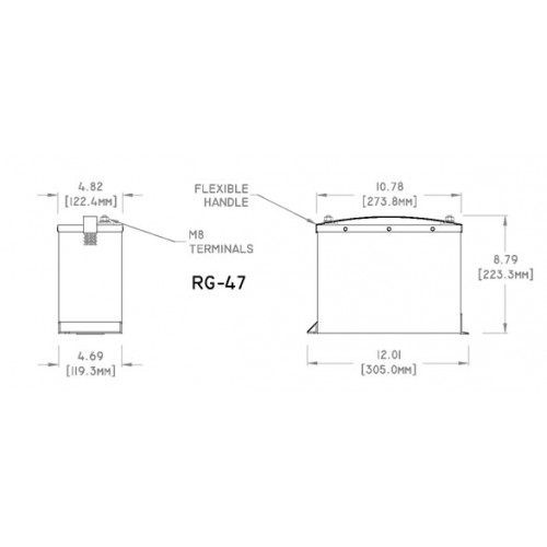 RG-47 is is fire resistant powder coated aluminum container with perforated vent areas machined into each side of the container. Two metal foot brackets are welded to the bottom of each side of the container. Aluminum powder coated cover is riveted to the container and the terminals at the top are male threaded posts. |