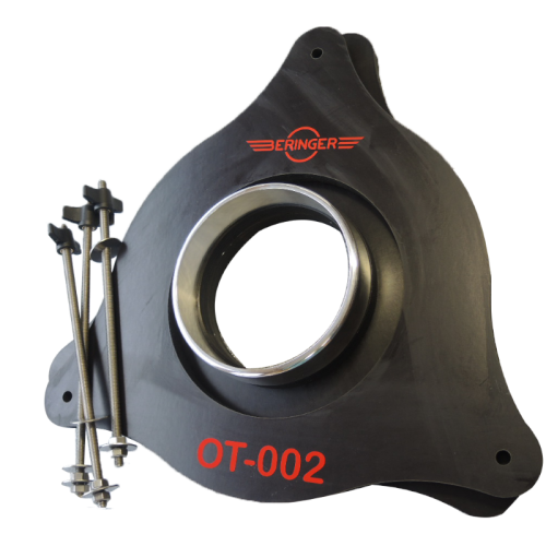 Specific tire change tool for BERINGER wheels with conical aluminum spacer to insert tire on wheel half. Plywood flanges maintain tire while positioning second wheel half with the O-ring.
