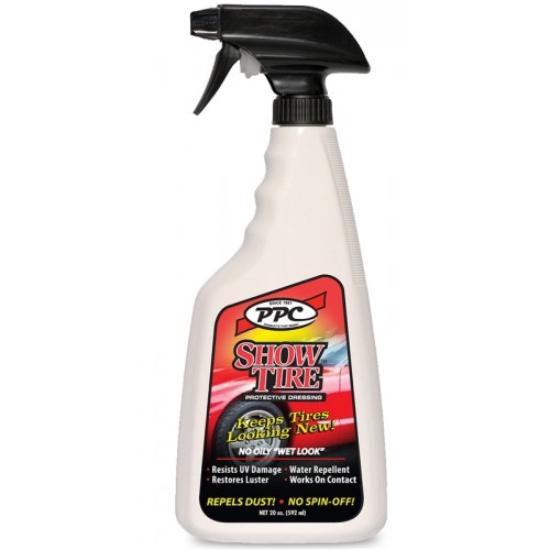 Your vehicle looks great! But your tires look horrible – oily, greasy, turning brown, acting like a dust magnet. You’ve been using one of those inferior name brand "protectants", haven’t you? Did you know that these "protectants" actually cause a major safety issue – sidewall tire destruction – as government-funded studies have shown? With PPC’s SHOW TIRE, this problem is solved! Developed at the request of street rod enthusiasts, our product exceeds all others in producing "new tire" appearance with no oily silicone film to draw dust. Tires treated with SHOW TIRE require very little maintenance and do not exhibit sidewall destruction. The safe water-based formula spreads quickly and evenly to give complete coverage with no hassle. Just let dry and give a slight buff to reveal the awesome sheen! |